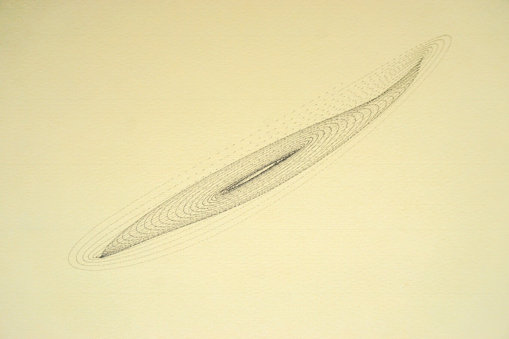 Watching the harmonograph does its drawing evoke a similar feeling to stargazing, constantly reminding me that, as a small, fragile being on Earth, I am a part of this vast universe; many like me will be born and will perish, but that does not diminish the beauty of sharing a moment of life with the turning Earth, while I still can. Just as the pendulum moves with rhythm, no matter how impecable the design or the craftsmanship, its movement will inevitably come to an end; yet while it swings, we’re drawn to its past, present, and future. In every limited moment of this swing, to dance is everything, and its fate is written in the frequency and the phase. Whether we wish it to continue, to stop, or to proceed differently, all is preordained. You can intervene, discard less-favored drawings, no matter — it will always begin again with the next cycle. This feeling of surrendering control — how marvelous it is.